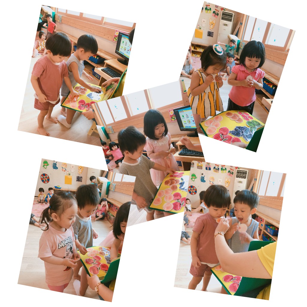 좋아하는 과일을 찾아 이름을 말해보고 냠냠먹는 흉내를 내는 활동이였답니다~~^^ 영어발음이 어색한지 선생님을 따라 말하다 웃는 모습이 너무나 귀여웠네요~^^ 그리고 코엔코 시간 선생님과함께 우물에서 점프!! 해보고 쏙들어가며 활동을하고서 금도끼 은도끼의 산신령을 만났어요~~^^ 나의 물건이 아니면 아니요~ 하고 음악에 맞춰 말해보고 오늘의 악기 “핸드벨”을 만나 연주해 주었답니다~^^ 가정에서도 행복한 오후시간보내세요~❤️.