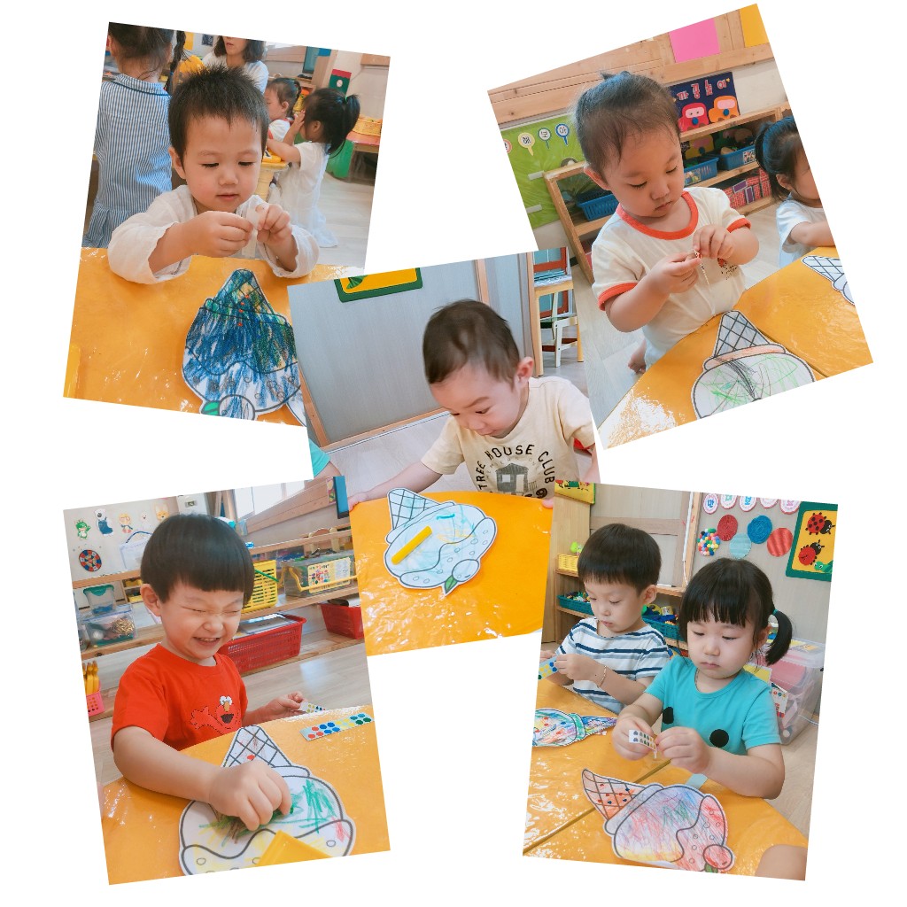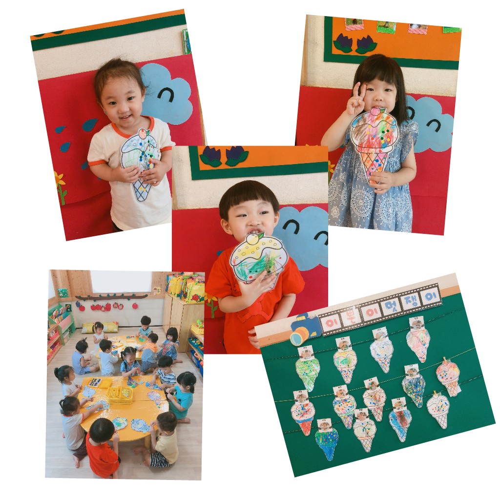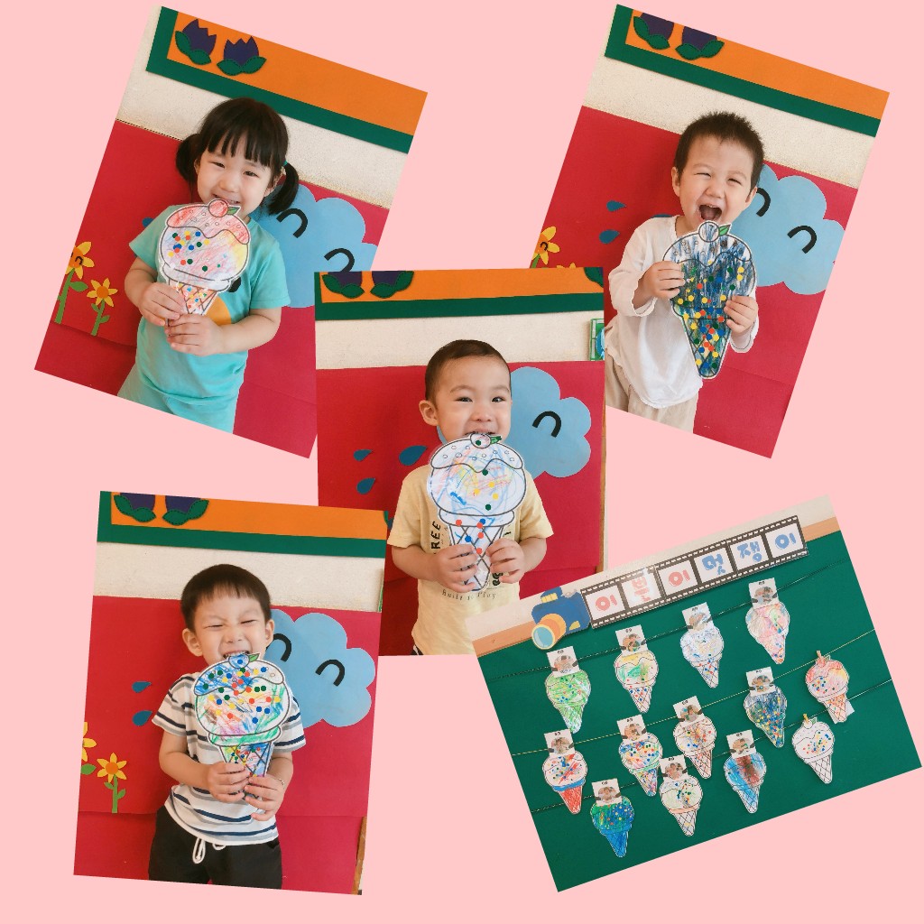오늘은 친구들이 너무나 좋아하는 스티커 붙이기 활동이있었어요~^^ 아이스크림은 하나만먹기로 약속하고 아이스크림 그림위에 알록달록 색칠해주고 스티커로 꾸며줬어요~^^ 코팅을해서 예쁜 사진도 찰칵!! 아이스크림먹는다며 아~ 하는모습이 너무나사랑스러웠답니다~^^