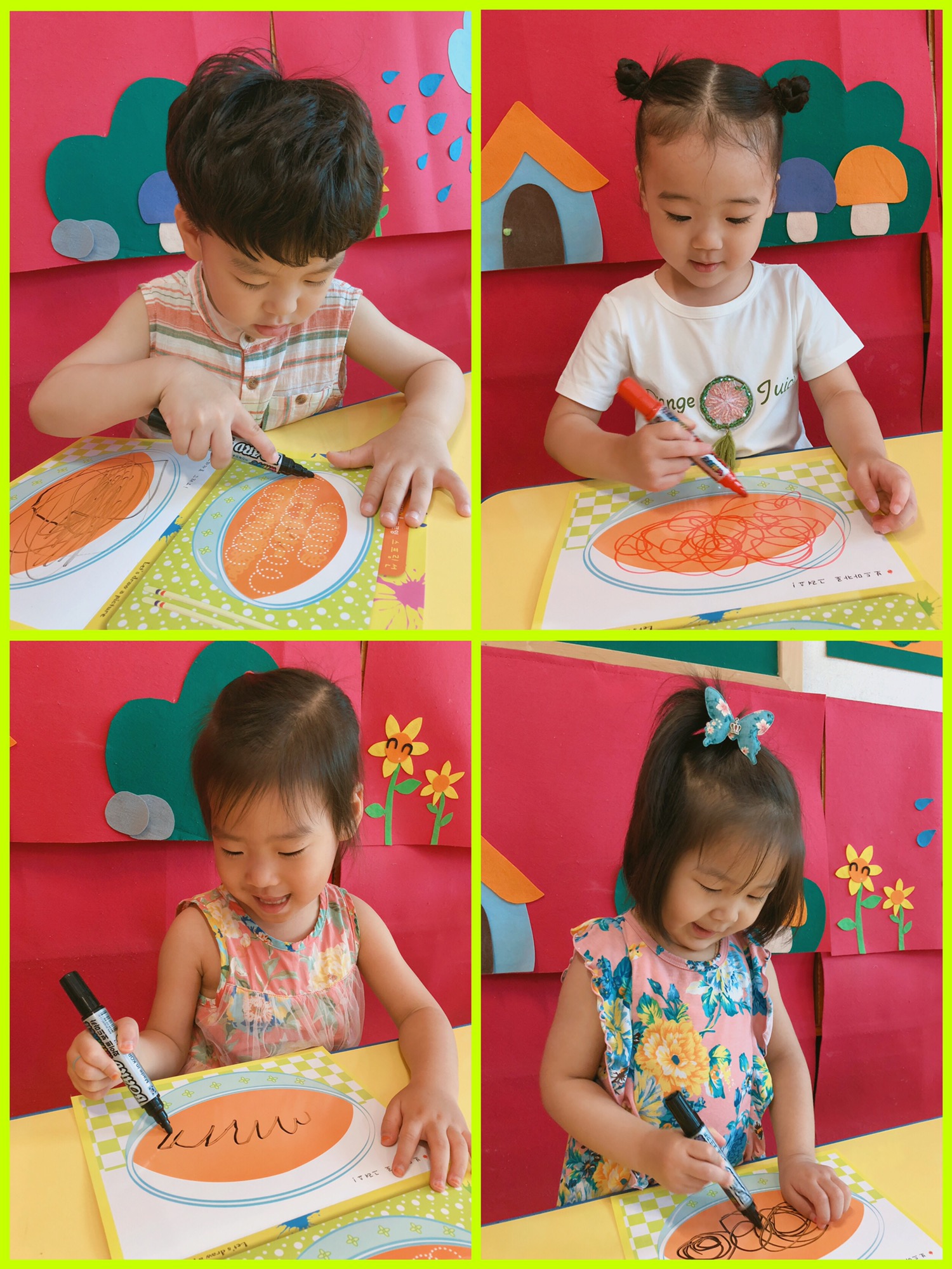 보드마카로 꼬불꼬불 맛있는라면을 그려주고 지우고 열심히 소근육 활동을 했어요^^