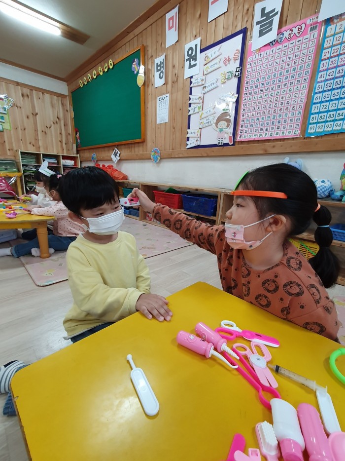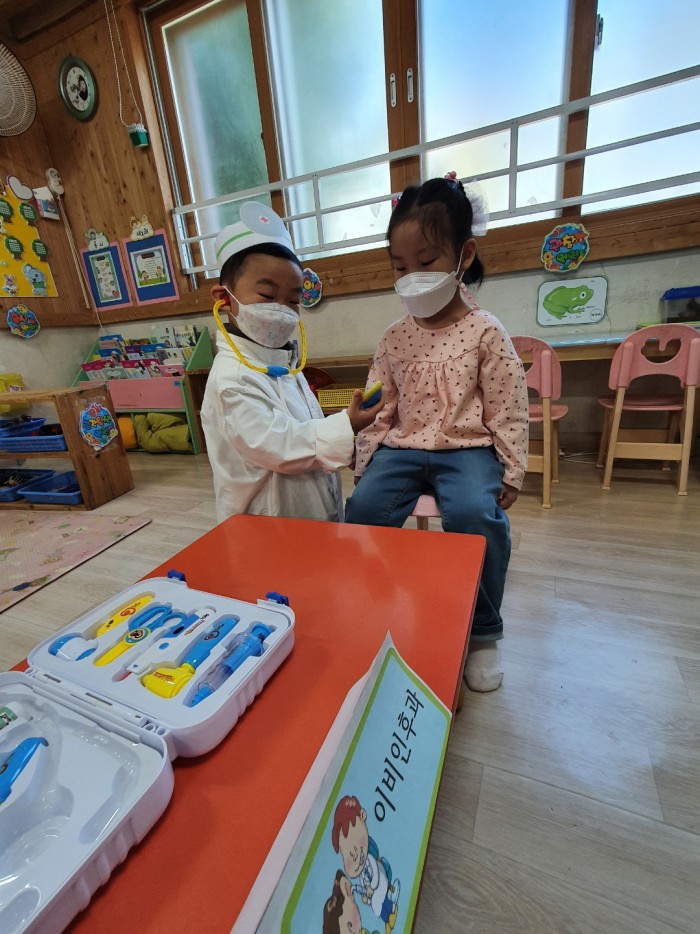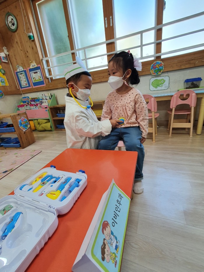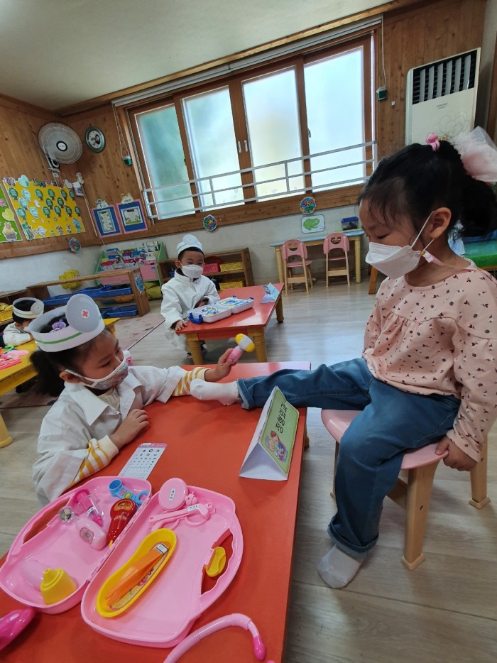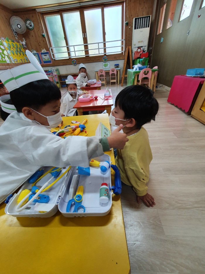 친구들과 원에서 의사선생님이 되어 병원놀이를 하며 역할놀이하는 시간을 가졌어요