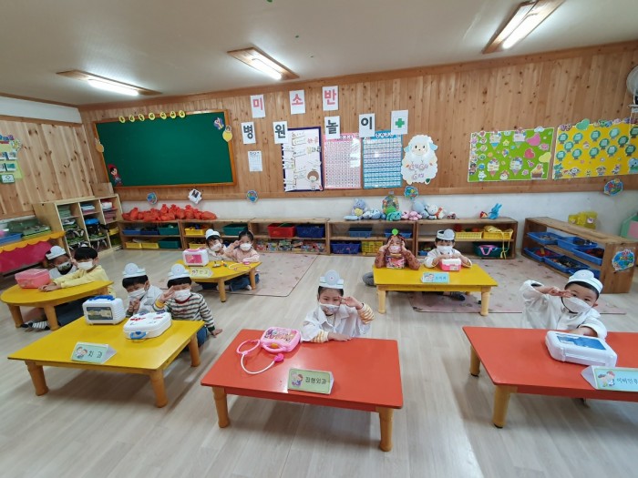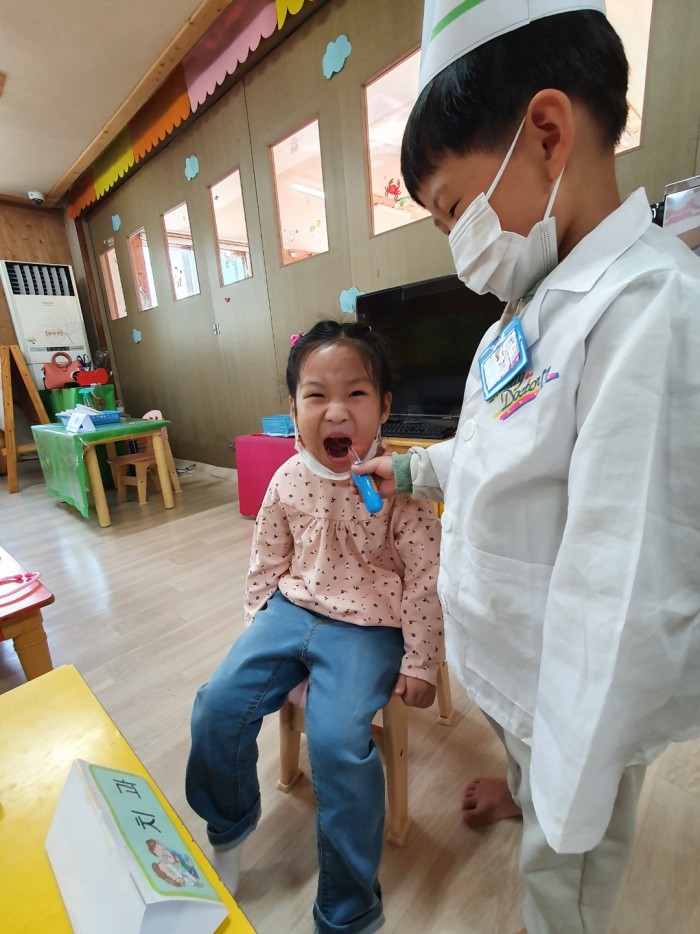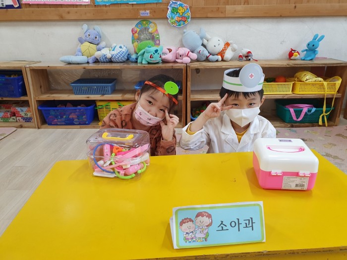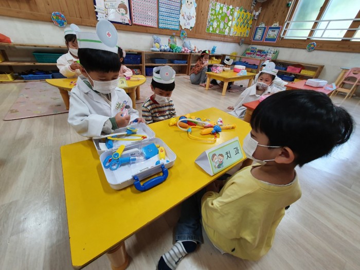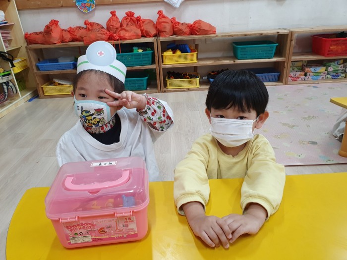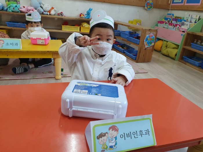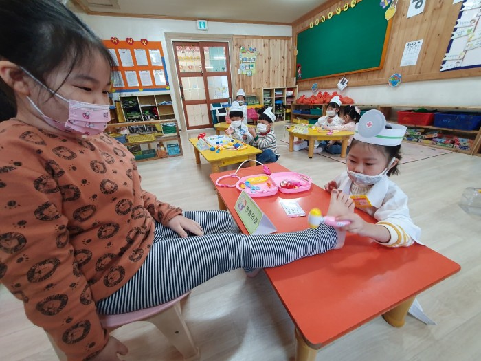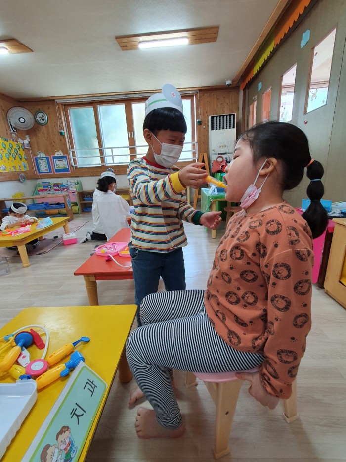 친구들과 원에서 의사선생님이 되어 병원놀이를 하며 역할놀이하는 시간을 가졌어요