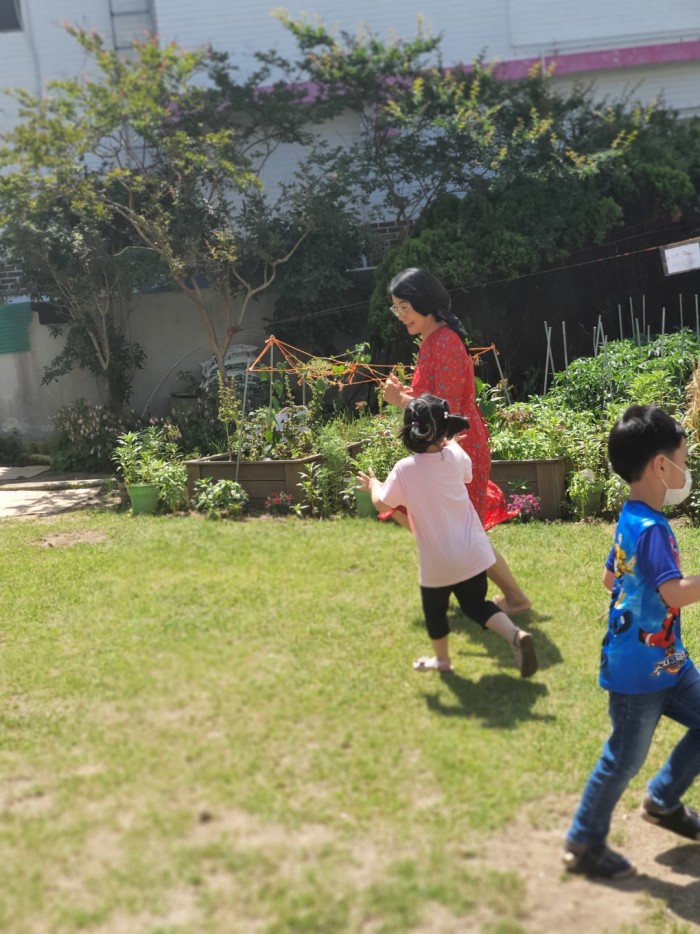 우리 친구들이 놀이터에서 신나게 뛰어놀며, 주변에 꽃과 나무를 관찰해보아요~