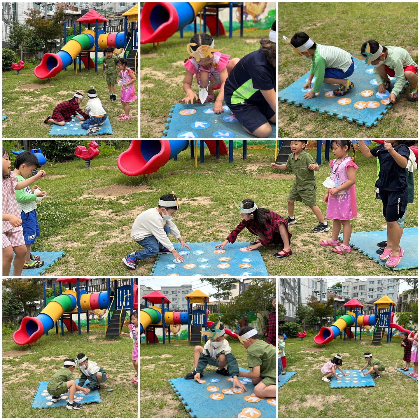 넓은 꿈동산 놀이터에서 발자국 뒤집기 게임을 했어요.