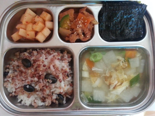 오늘의 메뉴 : 잡곡밥, 계란무국, 깍두기, 제육볶음, 김
