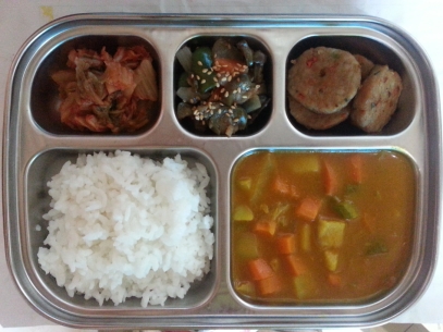 오늘의 메뉴 : 카레라이스, 배추김치, 가지볶음, 동그랑땡