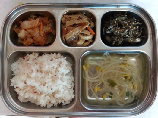 오늘의 메뉴 : 쌀밥, 맑은콩나물국, 볶은김치, 어묵당면볶음, 멸치볶음
