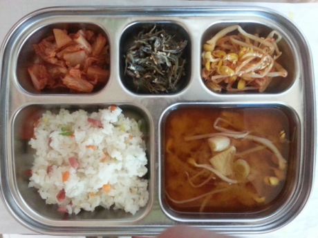 오늘의 메뉴 : 야채볶음밥, 콩나물된장국, 김치, 멸치볶음(콩나물무침)