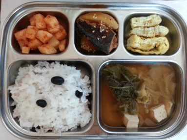 오늘의 메뉴 : 검은콩밥, 두부시래기된장국, 깍두기, 고등어감자조림, 계란말이