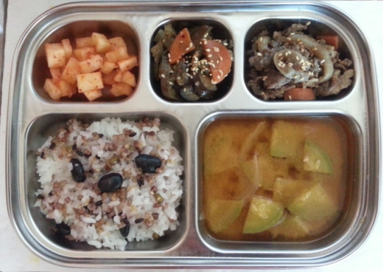 오늘의 메뉴 : 혼합잡곡밥, 애호박된장국, 깍두기, 가지볶음, 소불고기
