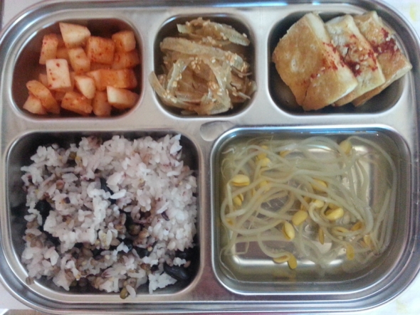 오늘의 메뉴 : 혼합잡곡밥, 콩나물국, 깍두기, 명엽채볶음, 두부부침