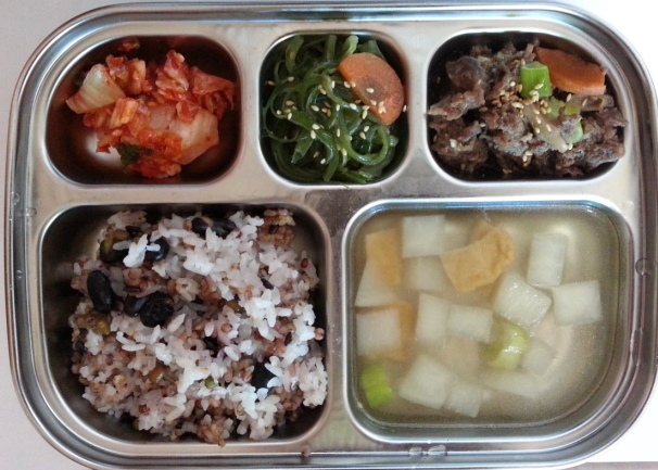 오늘의 메뉴 : 혼합잡곡밥, 어묵국, 소불고기, 미역줄기볶음, 김치
