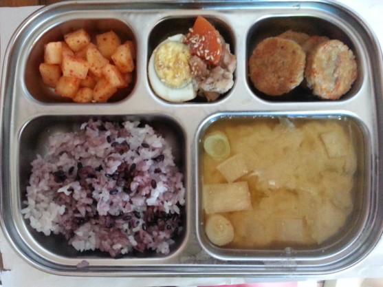 <오늘의 메뉴 : 잡곡밥, 감자두부된장국, 돈육계란장조림, 깍두기, 동그랑떙전>
