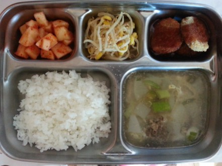 <오늘의 메뉴 : 흰쌀밥, 소고기 뭇국, 깍두기, 콩나물무침, 돈가스>
