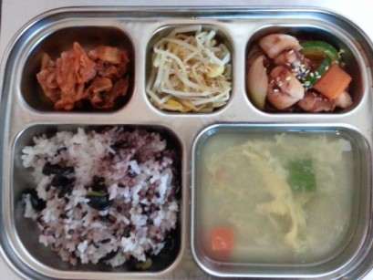 <오늘의 메뉴 : 검은콩밥, 계란북어국, 김치, 콩나물무침, 오징어볶음>