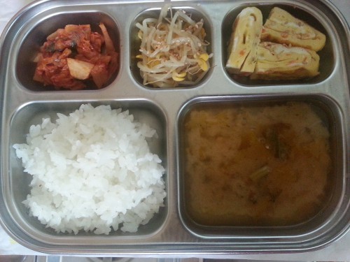 오늘의 메뉴 : 쌀밥, 두부된장국, 김치, 콩나물무침, 계란말이