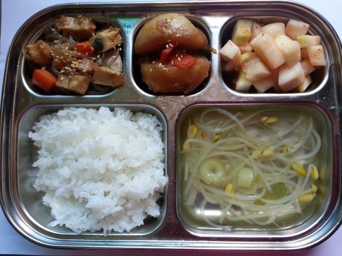 오늘 점심메뉴는 '밥, 콩나물국, 어묵잡채, 감자조림, 깍두기'입니다.