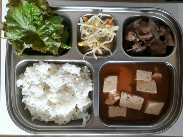 오늘의 메뉴 : 밥, 두부된장국, 돈육불고기, 상추/쌈장, 배추김치