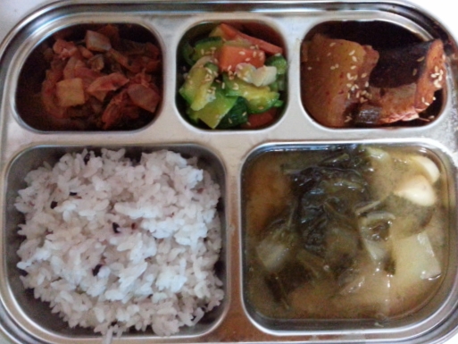 "오늘의 메뉴 - 쌀밥, 두부감자된장국, 고등어찜, 새우호박나물, 깍두기"