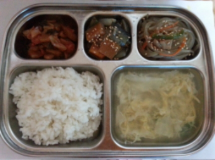 오늘의 메뉴 : 쌀밥, 잡채, 실파계란국, 가지볶음, 김치