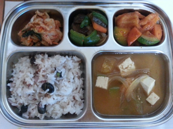 오늘의 메뉴 : 쥐눈콩밥, 청국장찌개, 돈육불고기, 버섯야채볶음, 배추김치