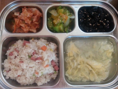 오늘의 메뉴 : 햄야채볶음밥, 실파계란국, 배추김치, 애호박볶음, 콩자반(김)