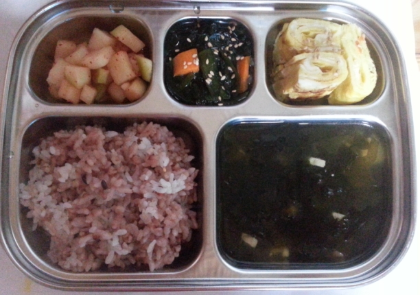오늘의 메뉴 : 잡곡밥, 닭가슴살미역국, 계란말이, 깍두기, 미역무침