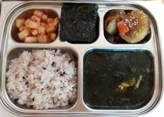 오늘의 메뉴 : 쌀밥, 닭가슴살 미역국, 김, 감자조림, 깍두기