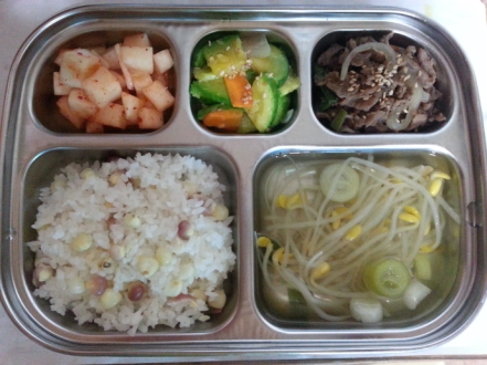 오늘의 메뉴 : 옥수수밥, 맑은 콩나물국, 소고기 불고기, 깍두기, 애호박볶음