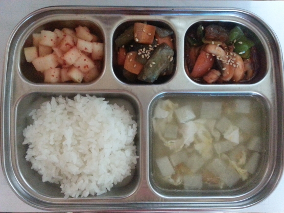 오늘의 메뉴 : 쌀밥, 어묵무국, 오징어볶음, 가지볶음, 깍두기